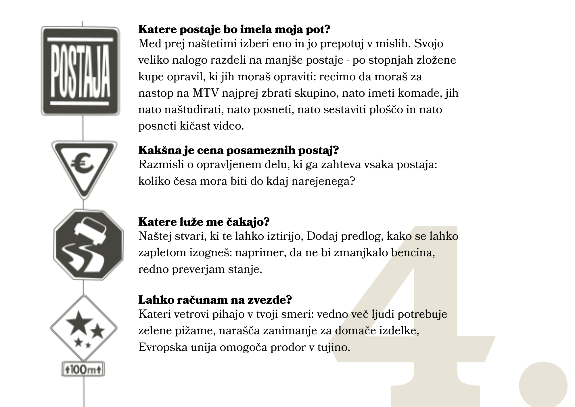 Sedaj si oglejmo spodnja vprašanja, da vidimo, kaj bi morali upoštevati. Ta vprašanja vam bodo pomagala pri dokončanju koraka 4 in vas približala uresničitvi vašega sanjarjenja.