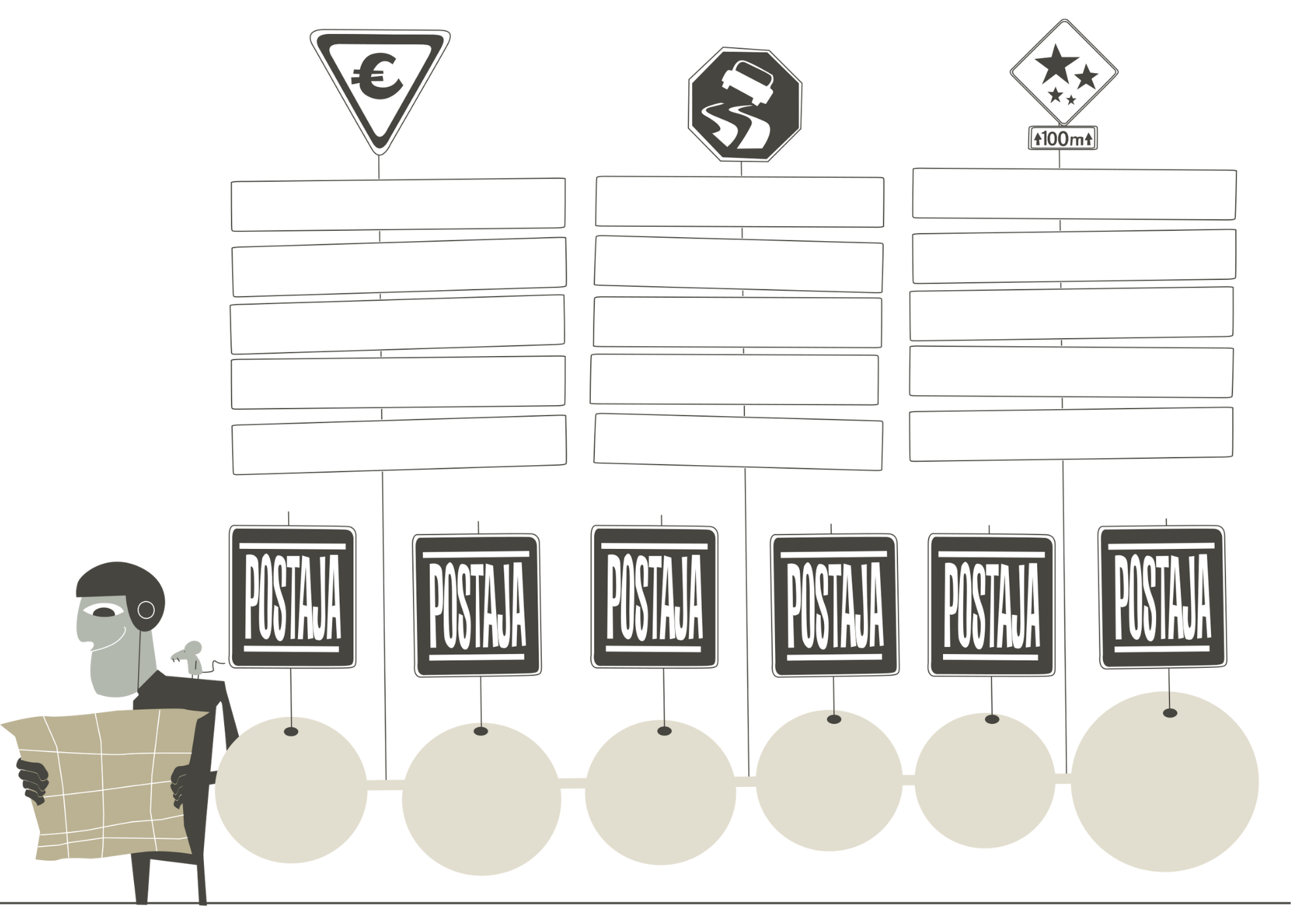 Vsak podvig je hud bav-bav, dokler ga ne razdeliš na kratke koščke. Začni secirati svojo pot. Jo opazovati. Na papirju so napake poceni, zato potuj brez zavor. Preštej postaje, stopnice ali otoke, ki jih moraš doseči. Zasluti morske pse, opazi dobre vile. Kaj so nasveti starih mačkov? Knjižnice? Interneta?