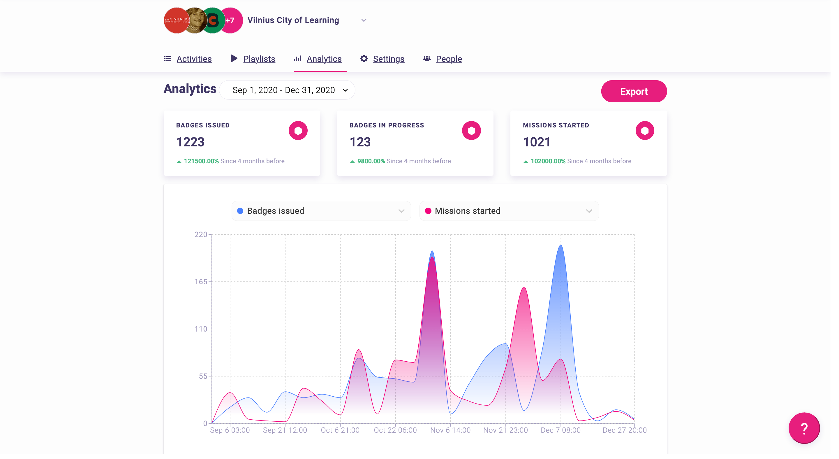 You can view analytics and generate reports showing stats of issued badges, badges in progress, quests started. You can compare and analyse stats between several categories, for example, badges issued, quests started, activity views and unique activity viewers. You can select a period to get a statistical overview and compare it to the same previous period.