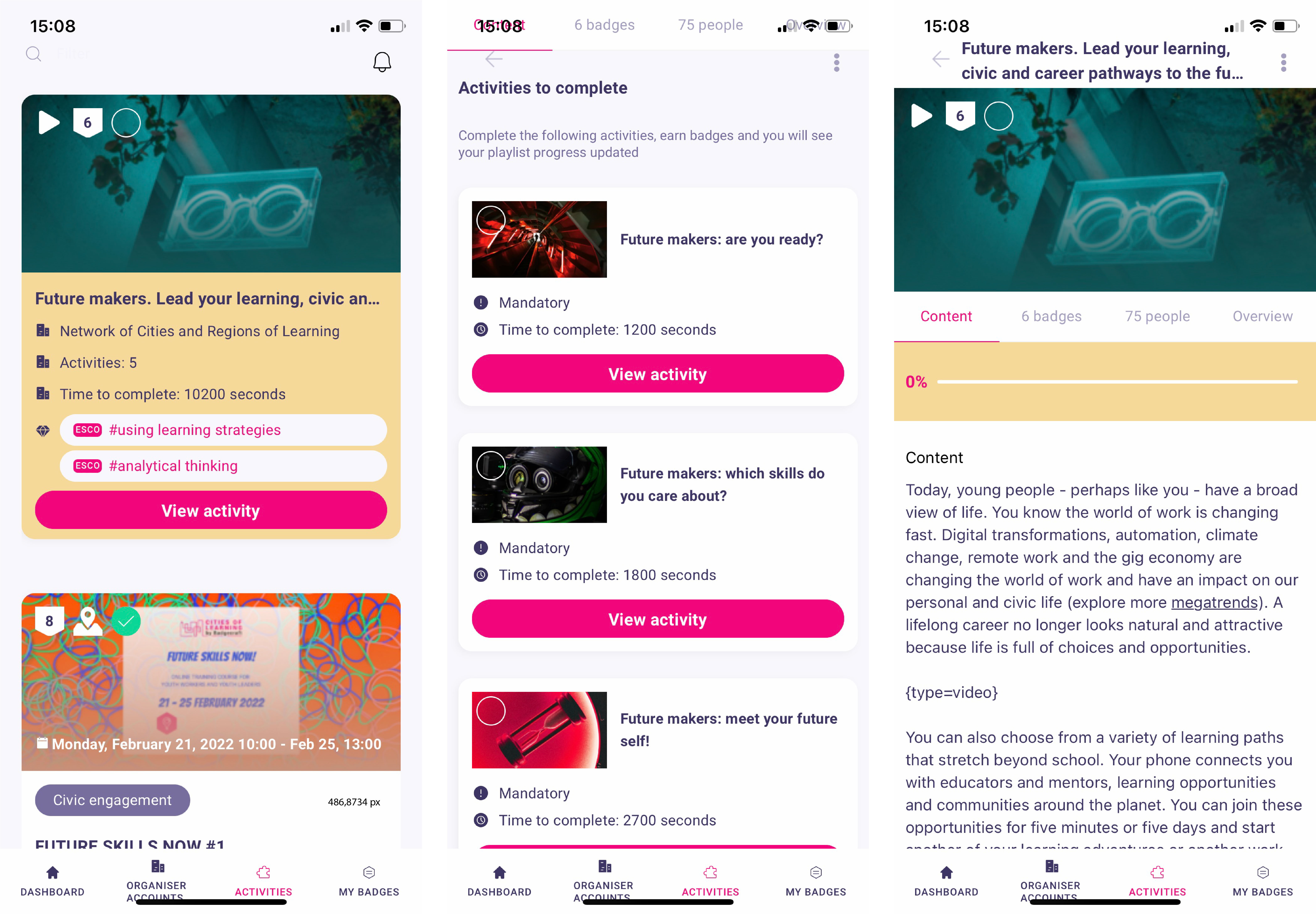 - Ver o conteúdo das atividades e listas de aprendizagem (playlists) e juntar-se a elas para participar e aprender.