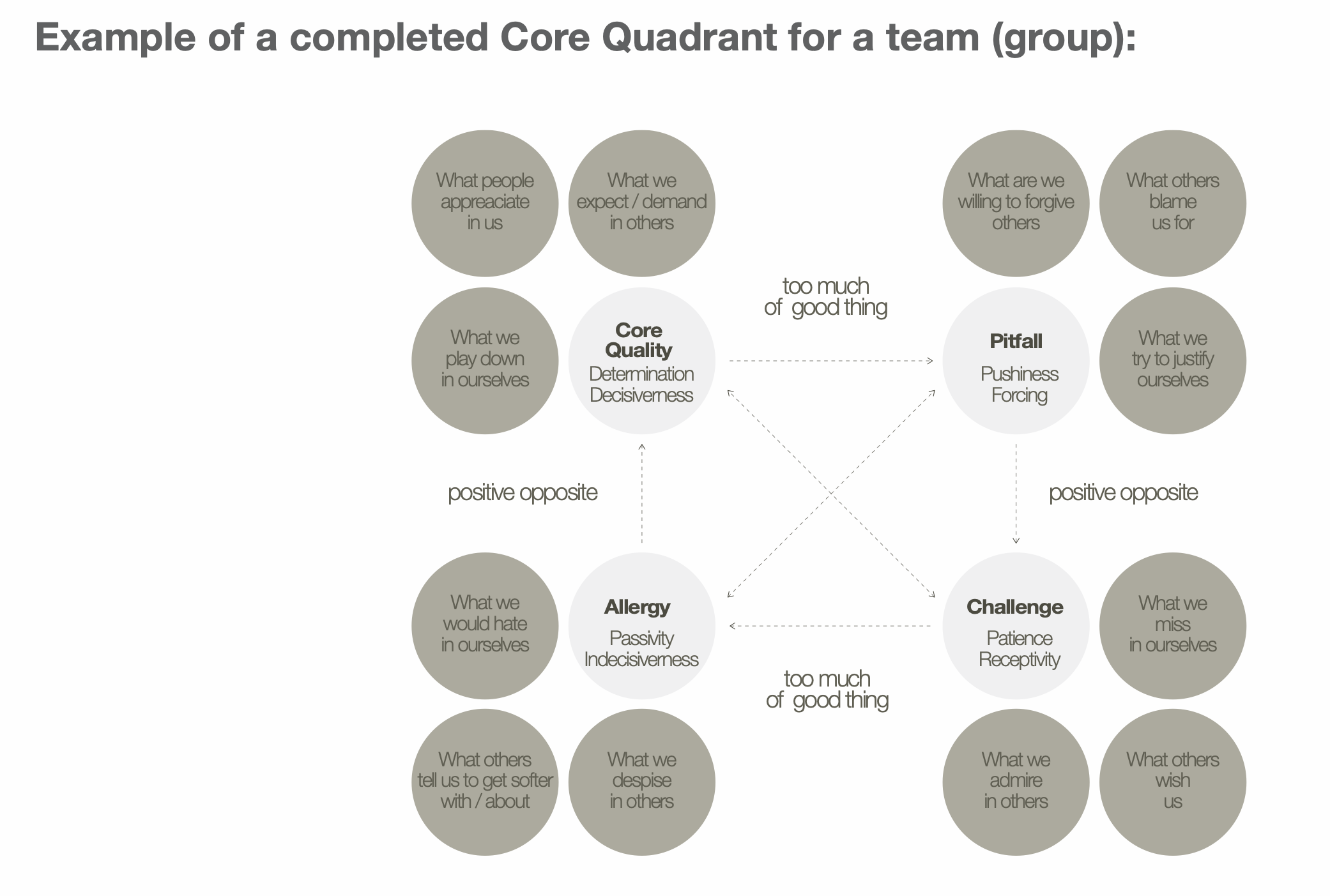 Select a few key qualities and explore them using the Core Qualities Quadrant logic. For each quality, reflect on how it can become a “pitfall” when overused, what complementary “challenge” could balance it, and what “allergy” or tension might arise in relation to other team members.